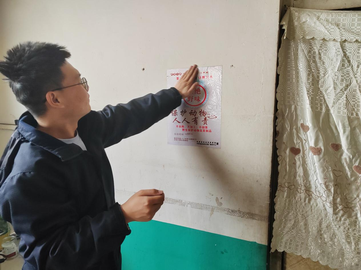 广泛宣传,牢固树立保护理念。采取发放宣传资料、张贴宣传画、讲解典型案例等方式,向村民、养殖户及餐饮从业人员普及《中华人民共和国野生动物保护法》等法律法规,广泛宣传野生动植物保护相关知识,积极倡导“不捕、不买、不卖、不食”野生动植物的文明理念,共发放宣传资料80余份,宣传人数100余人。