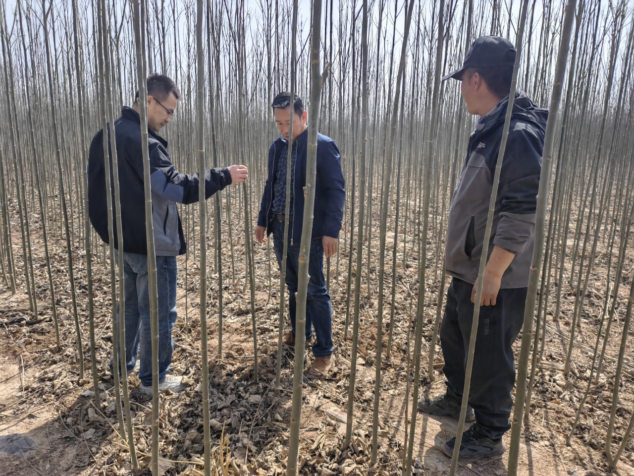 在树新林场河北杨良种育苗基地,相关负责人详细介绍了河北杨良种的育苗过程、技术难点及未来推广应用前景,工作组对河北杨良种的品种特性、生长态势、适应性等进行细致观察并检查了种苗质量。同时,为确保良种需求,双方就引进调拨事宜进行了商议。
