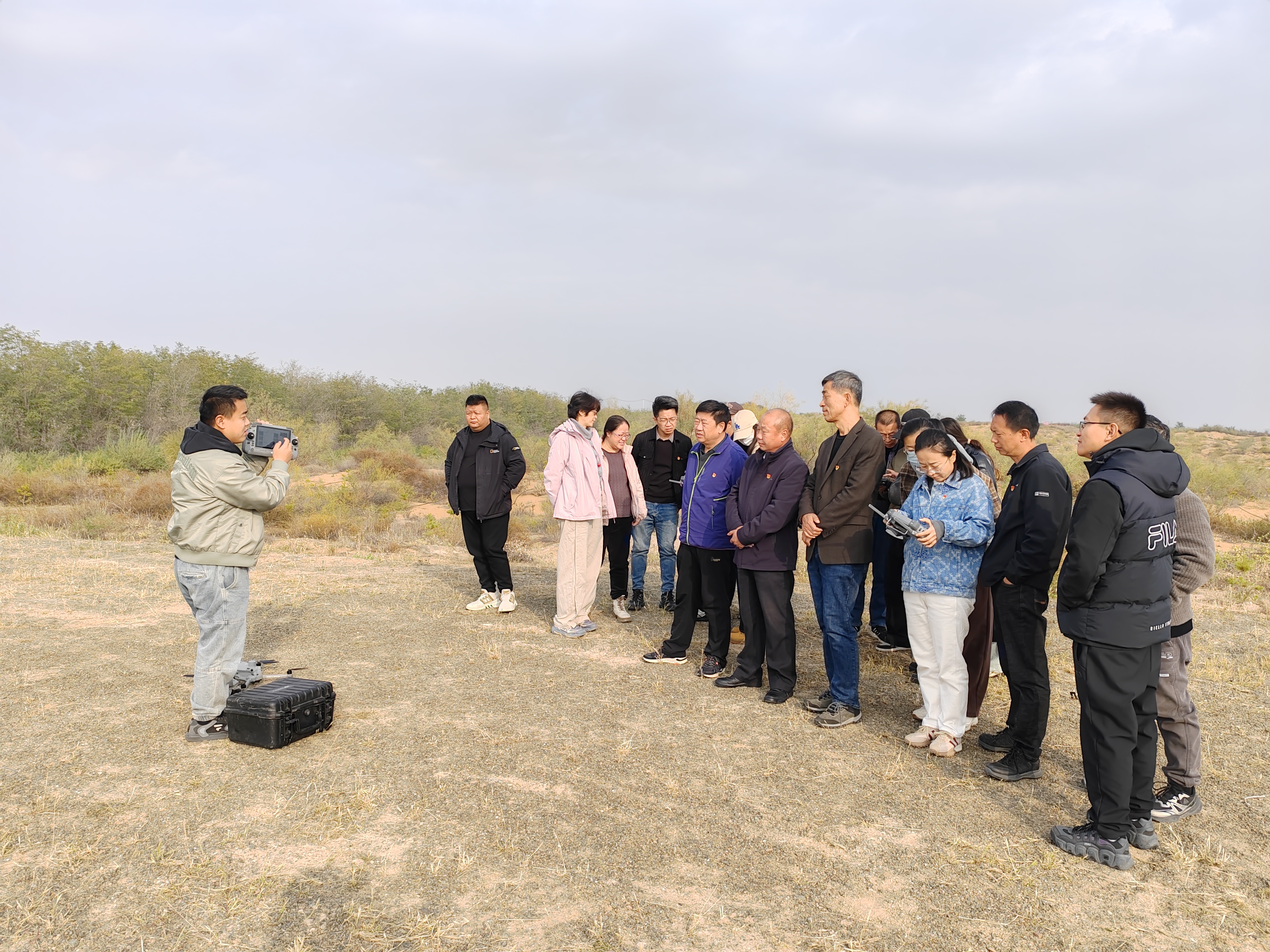随后,前往沙坡头治沙技术研究中心进行无人机实操。党员干部分组学习无人机操作技能,针对“如何通过无人机影像识别植被覆盖度变化”“沙化土地边界精准划定”等实操难题,技术专家现场演示、手把手教学,党员们通过“实操+提问”的方式,快速掌握无人机在生态监测中的应用技巧,为后续高效开展荒漠生态系统林草资源调查奠定基础。实操训练后,全体党员前往沙坡头规模化防沙治沙试点项目区,实地观摩生态保护与修复成果。在项目区现场,沙坡头管理局副局长刘荣国详细介绍“麦草方格固沙”“灌木林带建设”等经典治沙技术的应用历程。党员们沿着监测样线行走,查看植被生长状况,对照历史监测数据与现场实景,直观感受“监测数据指导治沙实践、治沙实践反哺监测优化”的良性循环,进一步明确林草调查监测工作的实践价值。