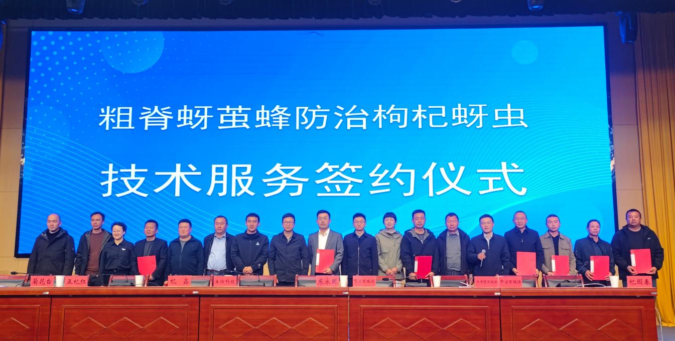 培训班上,中宁县委常委、政府副县长王文乾致欢迎词。宁夏枸杞生防科技有限公司与9家宁夏枸杞企业代表举行了粗脊蚜茧蜂防治枸杞蚜虫技术服务签约仪式,为明年的枸杞病虫害绿色防控体系建设注入新动能。