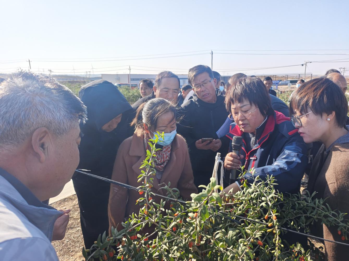 在现场教学环节,学员们前往杞鑫鸣沙基地进行实地观摩,专家们在田间地头为学员们现场讲解病虫害绿色防控技术最新应用情况,指导学员们辨认枸杞病虫害情况。学员们认真聆听讲解,不时拿出手机拍摄记录,有的还俯身仔细观察植株细节,并就实际种植中遇到的问题与专家深入交流。