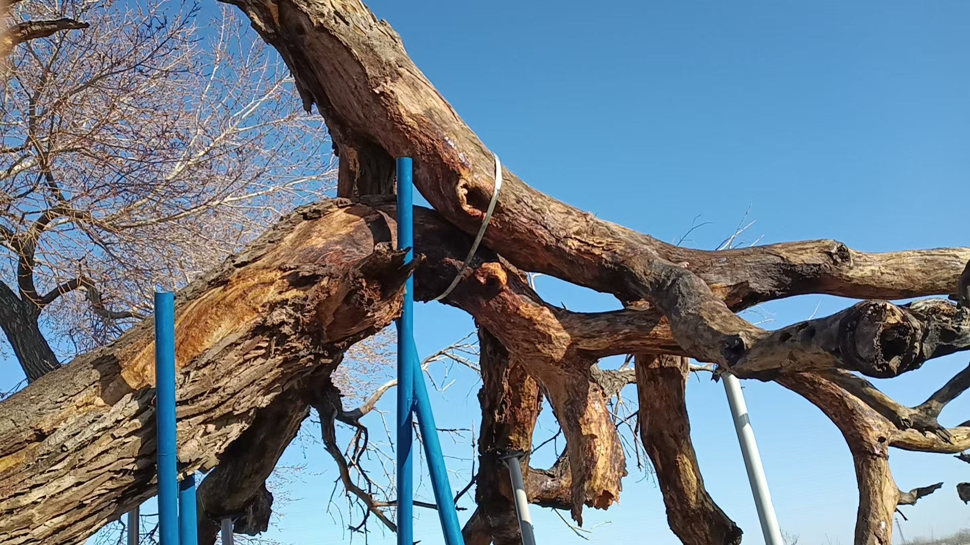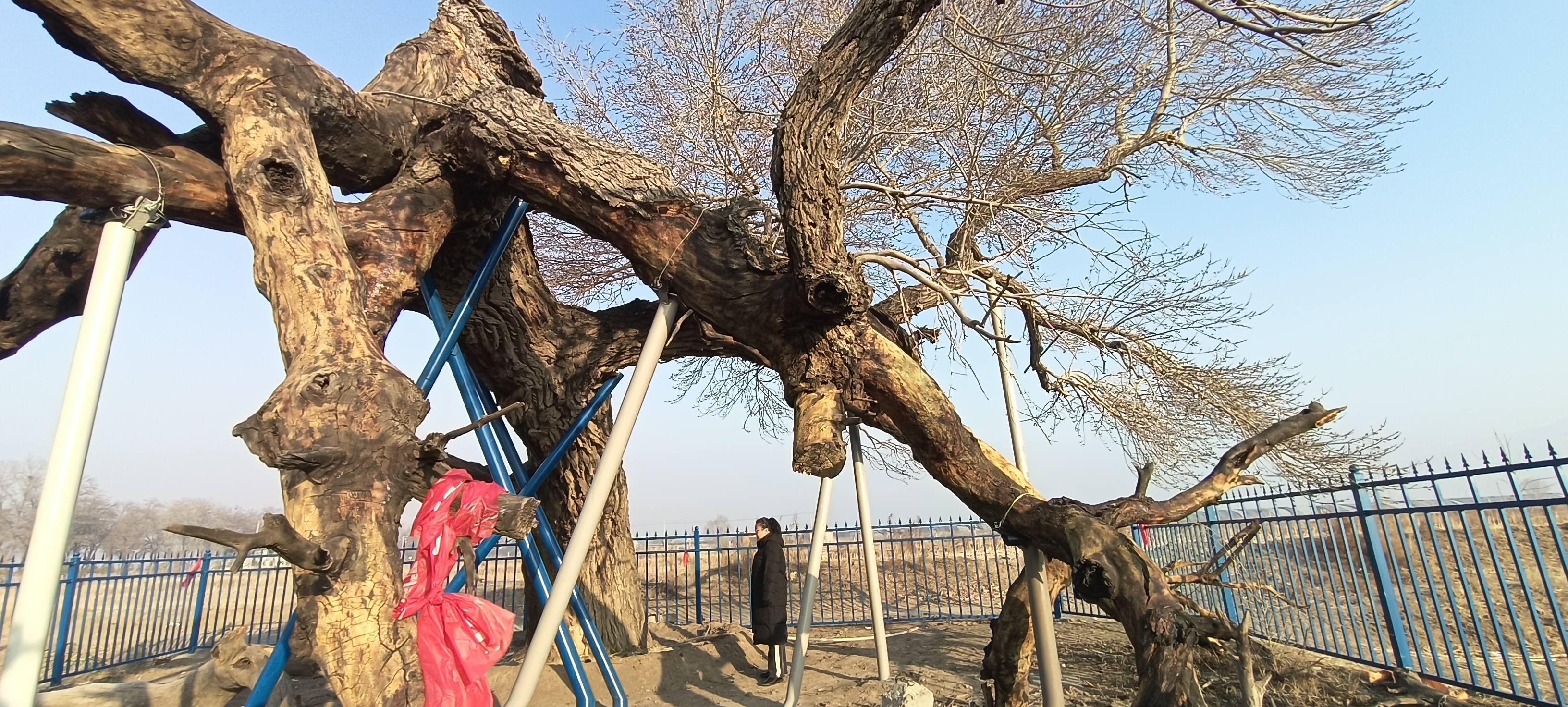 在大武口区长兴街道办事处新民村九队农田边有一株三百年的小叶杨古树,树高约12m,胸径1.59m,历经岁月沧桑,目前小叶杨古树仅西北部有萌发树枝,但生长势弱。为了让小叶杨古树焕发新的生命力,延续其生态、文化与科研价值,在自治区林业和草原局的大力支持、自治区国有林场和林木种苗工作总站多次指导下,大武口区林草局2025年实施了树体修复、树冠整理、树体加固、地下环境改良等一系列抢救复壮措施。