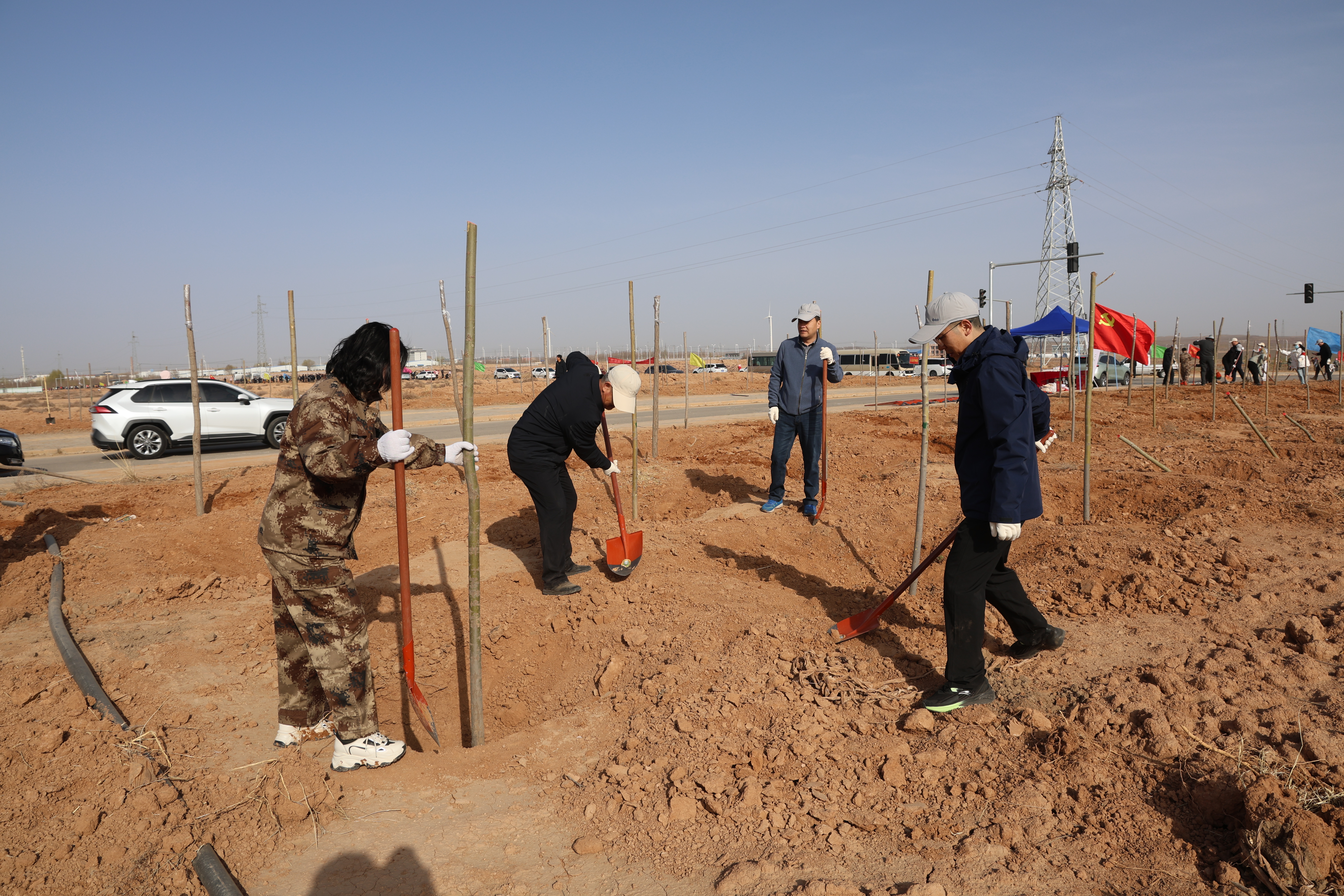 在植树现场,林业技术骨干化身“教员”,围绕“扶正、培土、踩实”等关键环节进行示范讲解,强调科学造林要点,确保苗木成活率。全体党员分组协作,挥锹培土、扶苗浇水,各个环节衔接有序,一派热火朝天的劳动景象。经过共同努力,新栽苗木整齐排列,为春日大地增添一抹新绿。