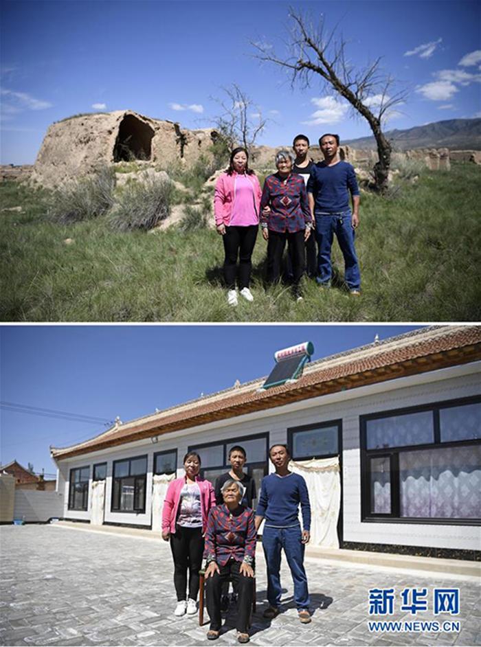 拼版照片:上图为宁夏吴忠市红寺堡区红寺堡镇红海村移民冯自禄(右一)与母亲蔡润英(左二)、妻子周玉英(左一)、儿子冯思恺在新庄集乡老房子原址留影;下图为冯自禄一家在移民村自家住房前留影(9月8日摄)。冯自禄一家2002年从新庄集乡朱庄子村迁出,现在家里种了60亩枸杞,妻子周玉英在红寺堡镇恒丰纺织厂打工,家庭年收入在20万元左右。 新华社记者 郭绪雷 摄