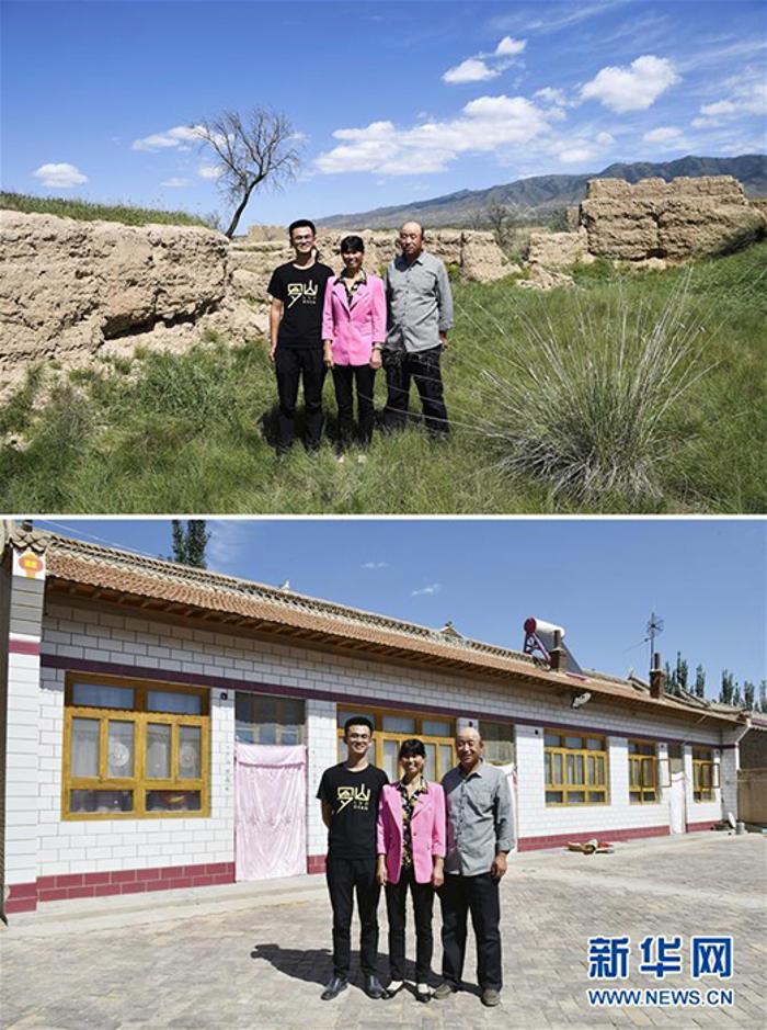 拼版照片:上图为宁夏吴忠市红寺堡区红寺堡镇中圈塘村移民乔文生(右)与妻子高慧珍(中)、儿子乔英波在新庄集乡关口村老房子原址留影;下图为乔文生一家在移民村自家住房前留影(9月8日摄) 新华社记者 郭绪雷 摄