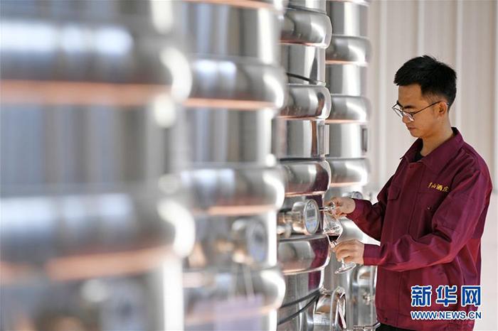 宁夏吴忠市红寺堡区红寺堡镇中圈塘村村民乔英波在罗山酒庄对葡萄酒进行取样(9月8日摄) 新华社记者 郭绪雷 摄