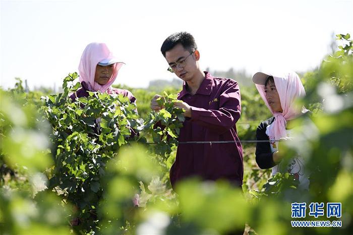 宁夏吴忠市红寺堡区红寺堡镇中圈塘村村民乔英波(中)在罗山酒庄葡萄基地向农户讲解葡萄藤养护知识(9月8日摄) 新华社记者 王鹏 摄