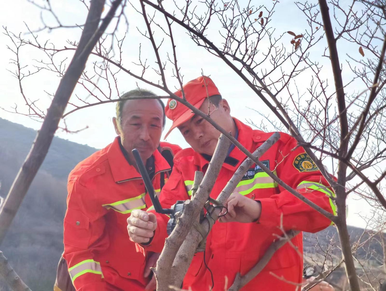 李智(右)和火龙沟护林点点长王兴发在固定红外相机。