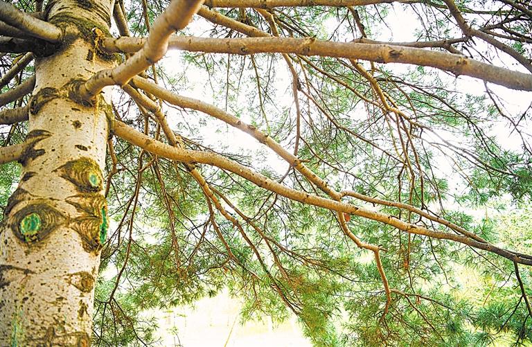 “华山松幼树,树皮呈灰绿色或淡灰色且平滑。随着树龄增长,树皮会逐渐开裂成方形或长方形的厚块片,或固着于树干、或脱落。目前,还没有见过华山松开裂的树皮。”王利霞说。