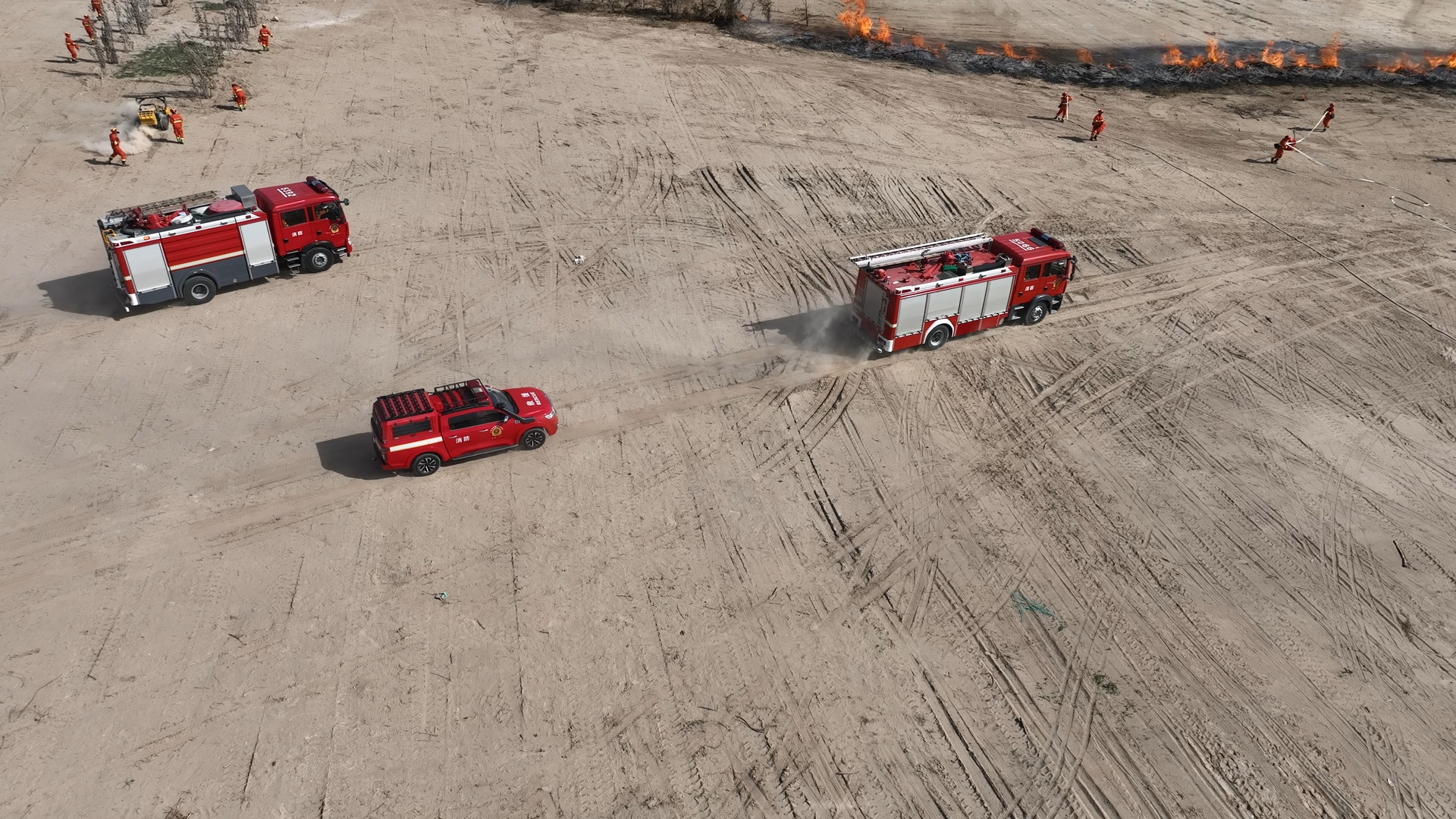 演练模拟贺兰山保护区马莲口管理站辖区突发森林火情,视频监控烟火识别系统第一时间发出预警。管理站迅速开展先期扑救,但受气候干燥、可燃物载量大影响,火势快速蔓延,管理局随即启动应急预案,统筹调配力量开展科学扑救。扑火队员熟练运用风力灭火机、高压细水雾、水泵等传统装备,同步投入防火隔离带开辟机器人、无人机投掷灭火弹等新型设备,精准采用“强攻推进”“递进超越”战术,牢牢把握风力减弱、气温回落、火势趋缓的有利时机,高效控制火势并成功扑灭。整个演练过程紧扣“实战化、专业化、科技化”要求,完整演练了监测预警、信息上报、应急响应、队伍集结、火场扑救、医疗救护及火场侦查等全流程环节。