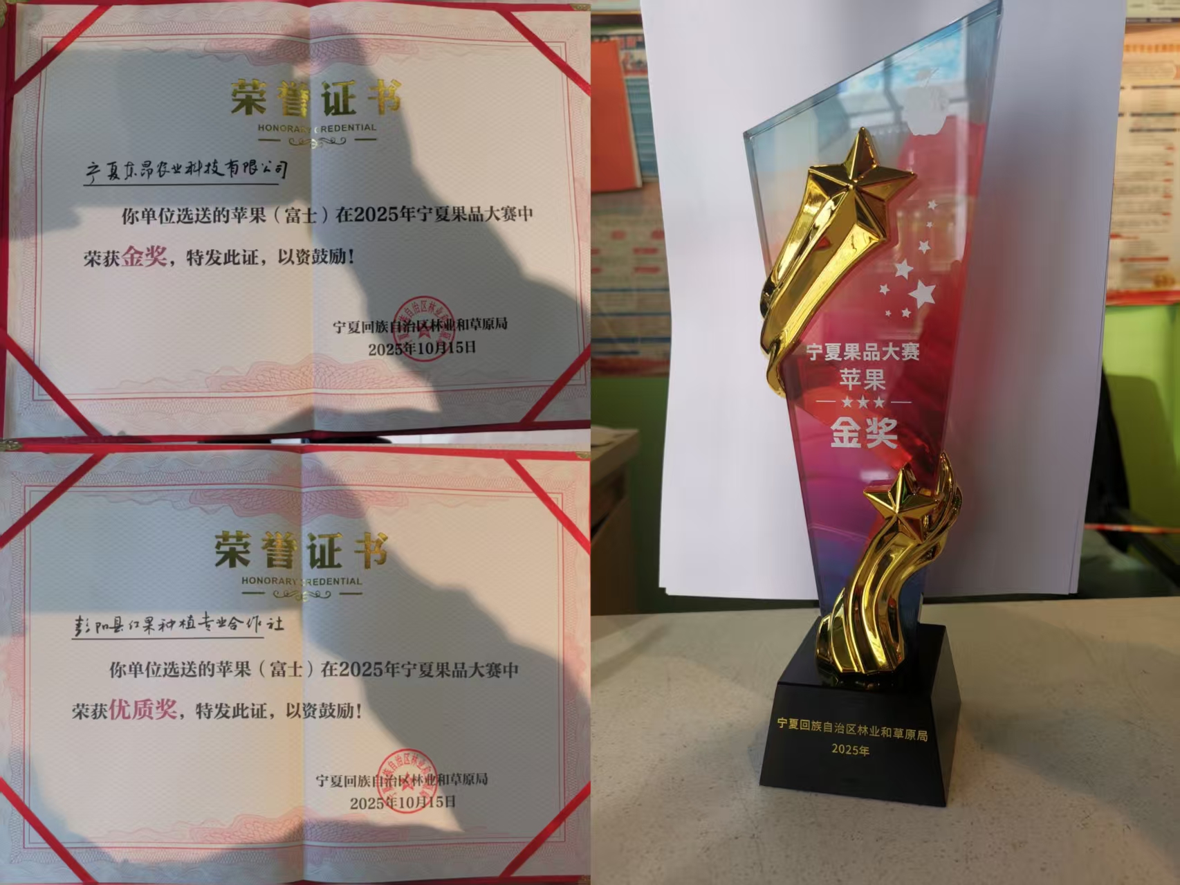 金秋送爽,硕果飘香。短短两日内,彭阳苹果在区内外赛事中捷报频传、连摘重奖。10月16日,在2025年中国苹果产销峰会暨静宁苹果招商推介活动同期举办的“盛世好苹果”大赛中,彭阳苹果斩获银奖。而就在此前一天闭幕的2025年宁夏果品大赛暨沙坡头旱苹果品牌推介活动上,彭阳富士苹果已率先获得金奖1项、优质奖1项。