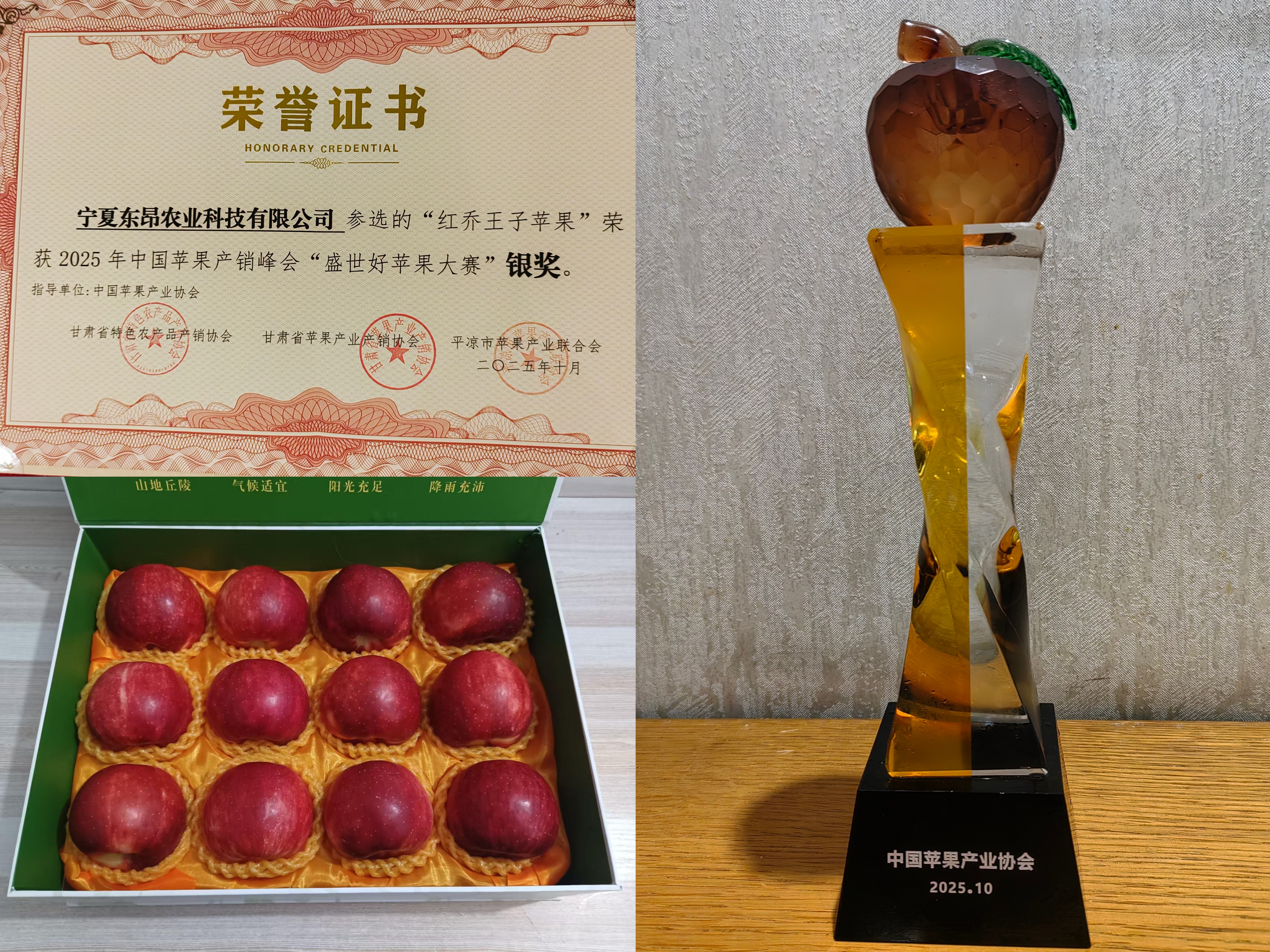 作为全国苹果产业的年度重要盛会,2025年中国苹果产销峰会期间的“盛世好苹果”大赛由中国苹果产业协会在甘肃省平凉市举办,来自甘肃、陕西等全国主要苹果产区的多家种植户、合作社及农业企业,携30多个系列的优质苹果参展,由国内苹果种植栽培、农产品质量检测、园艺学等领域的权威专家组成评审团,经过综合评审,彭阳县宁夏东昂农业科技有限公司选送的“红乔王子”凭借优良的品质脱颖而出,斩获银奖。