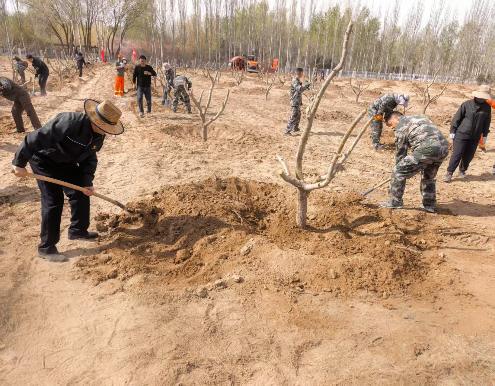 党旗飘扬在植树现场,党员干部分工协作,挥锹铲土、扶苗定植、踏实围堰,各环节衔接有序。有植树经验的同志边干边做技术指导,青年干部挥舞的铁锹越来越熟练,经过一上午紧张有序的劳动,新栽的树苗整齐排列、迎风而立。